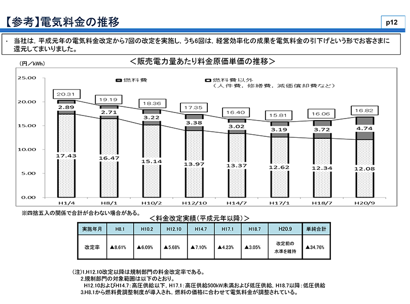 海輪誠・取締役社長は記者会見で、電気の安定供給と経営効率化にはこれまでも継続的に取り組んできたことを強調。第二次石油危機に伴う1980年(昭和55年)の値上げ改定以降は、「これまで9回の本格改定を実施し、合計で約3割の電気料金の低減を行ってまいりました」と説明しました。